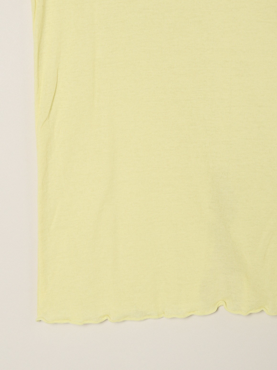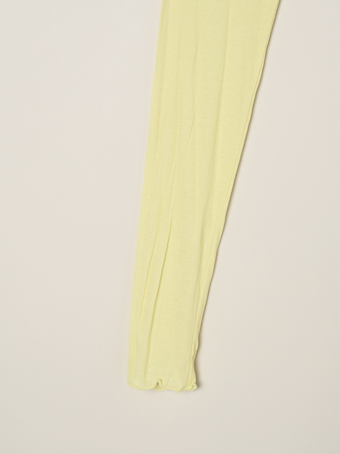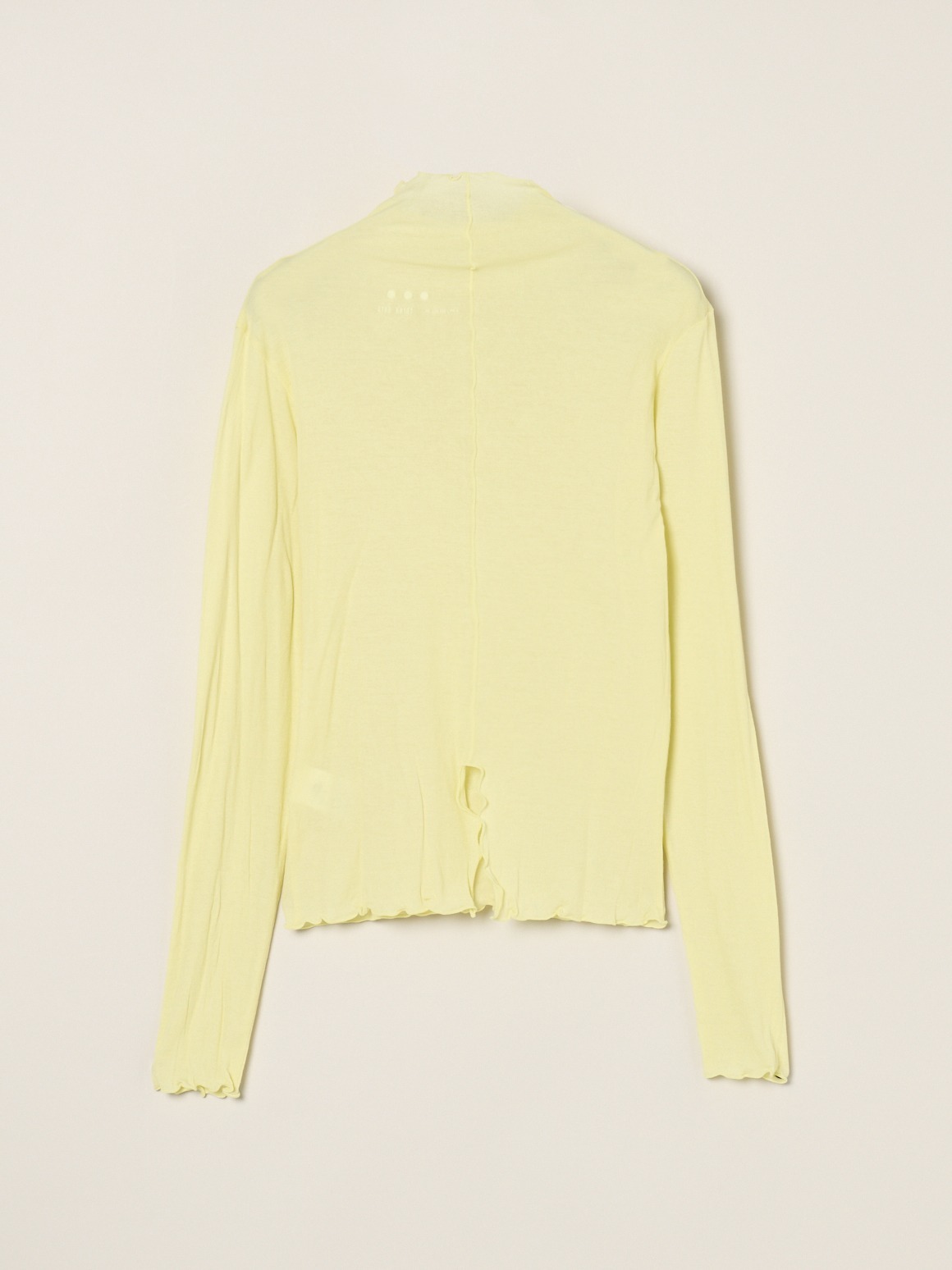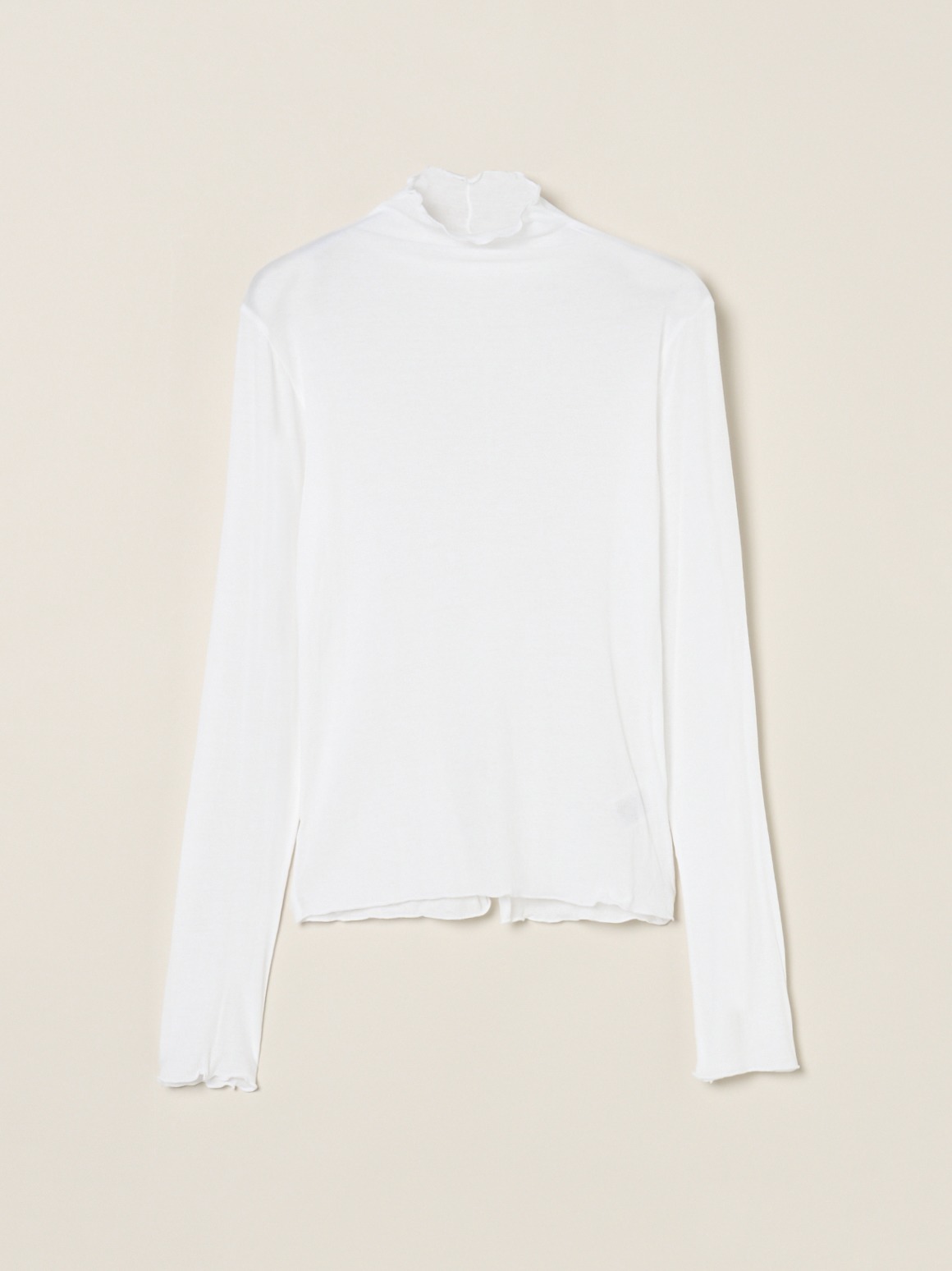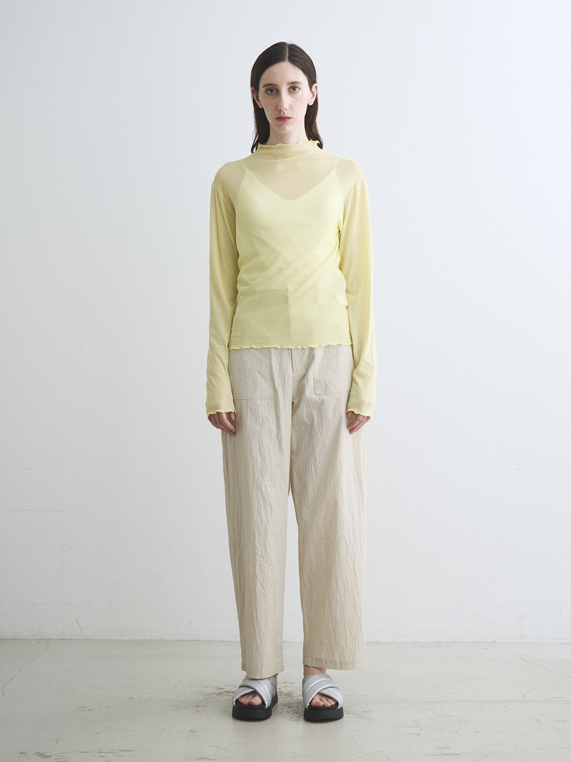 手の甲にかかる長めのロングスリーブです。ネック端などの始末はメロウと呼ばれる波打ったデザインで、重ね着のインにしても印象的。ネックが2重のタートルバージョンよりも軽やかに着用いただけます。
