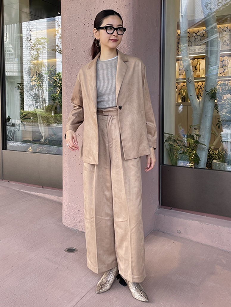 スウェード調のパンツはシーズンムードが高まるアイテム。