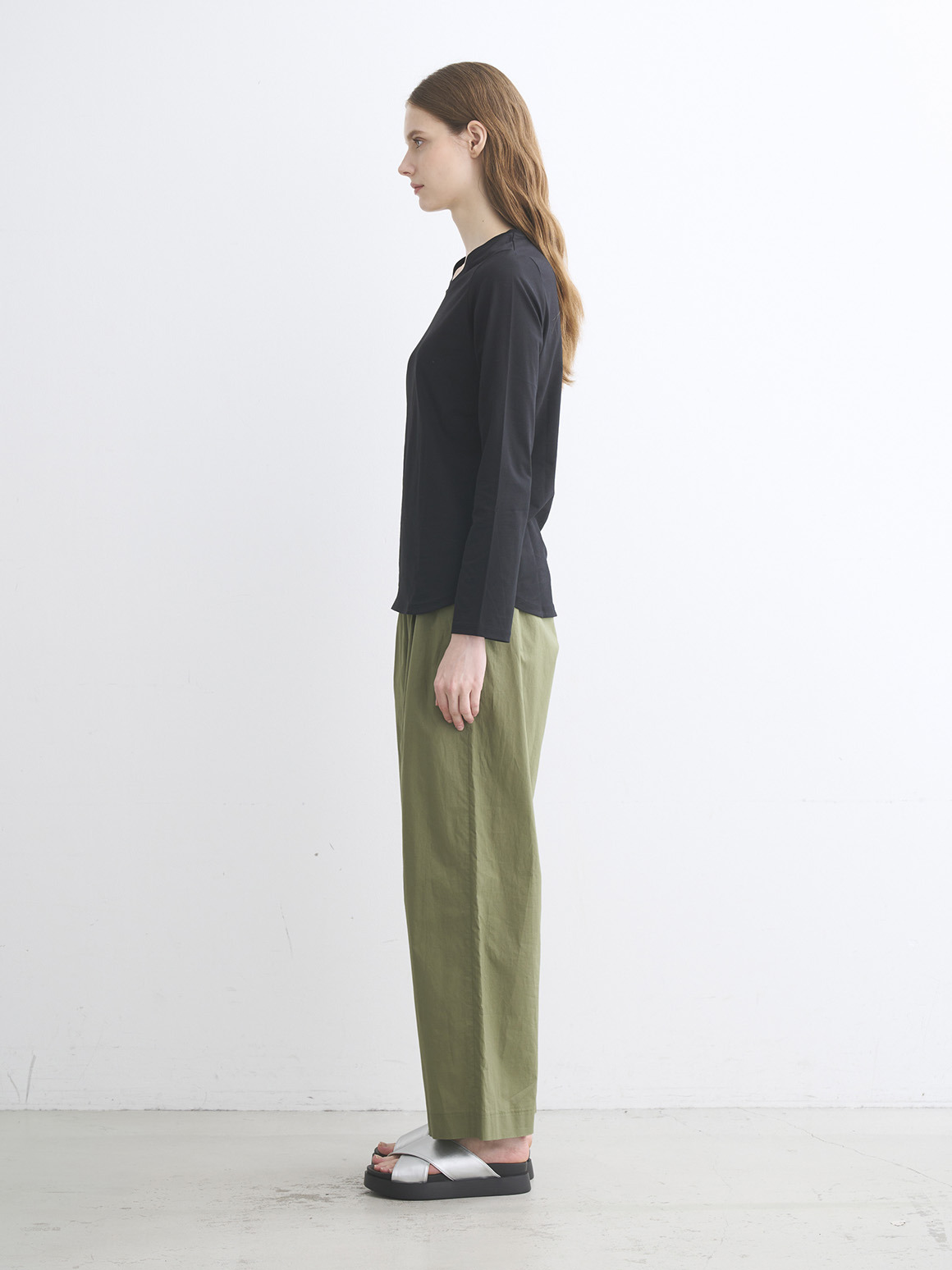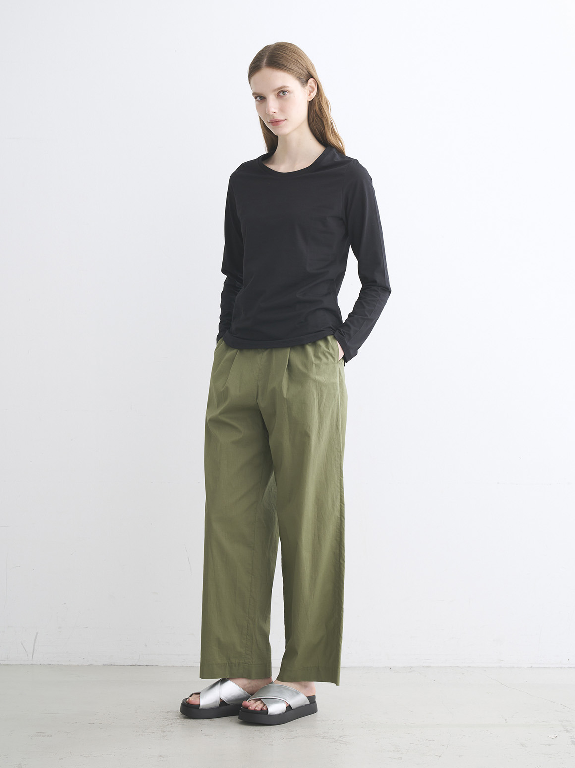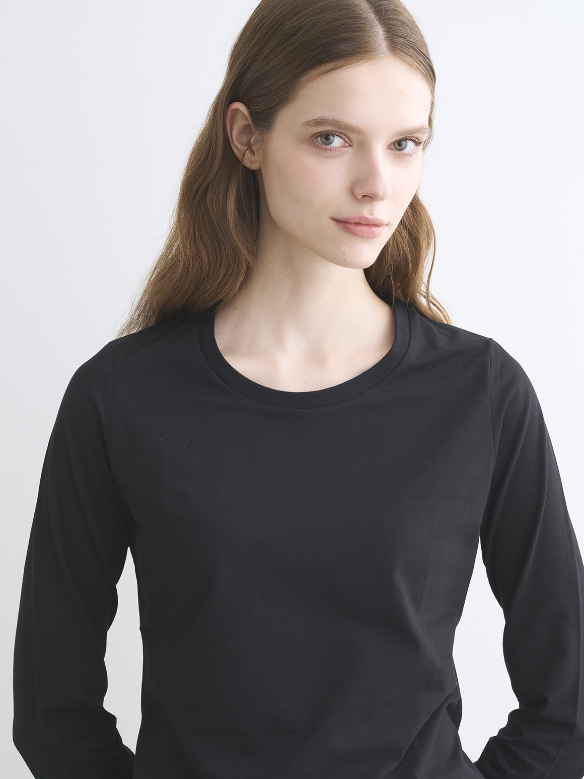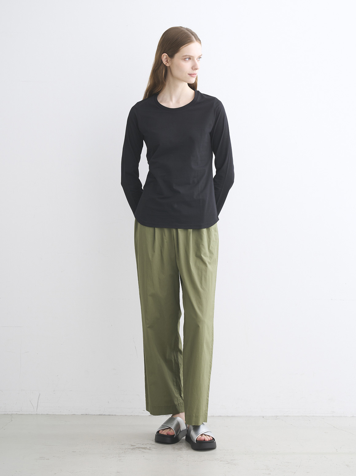 上品な光沢とシャツライクなハリのパウダリーコットン素材のクルーネックTシャツ。