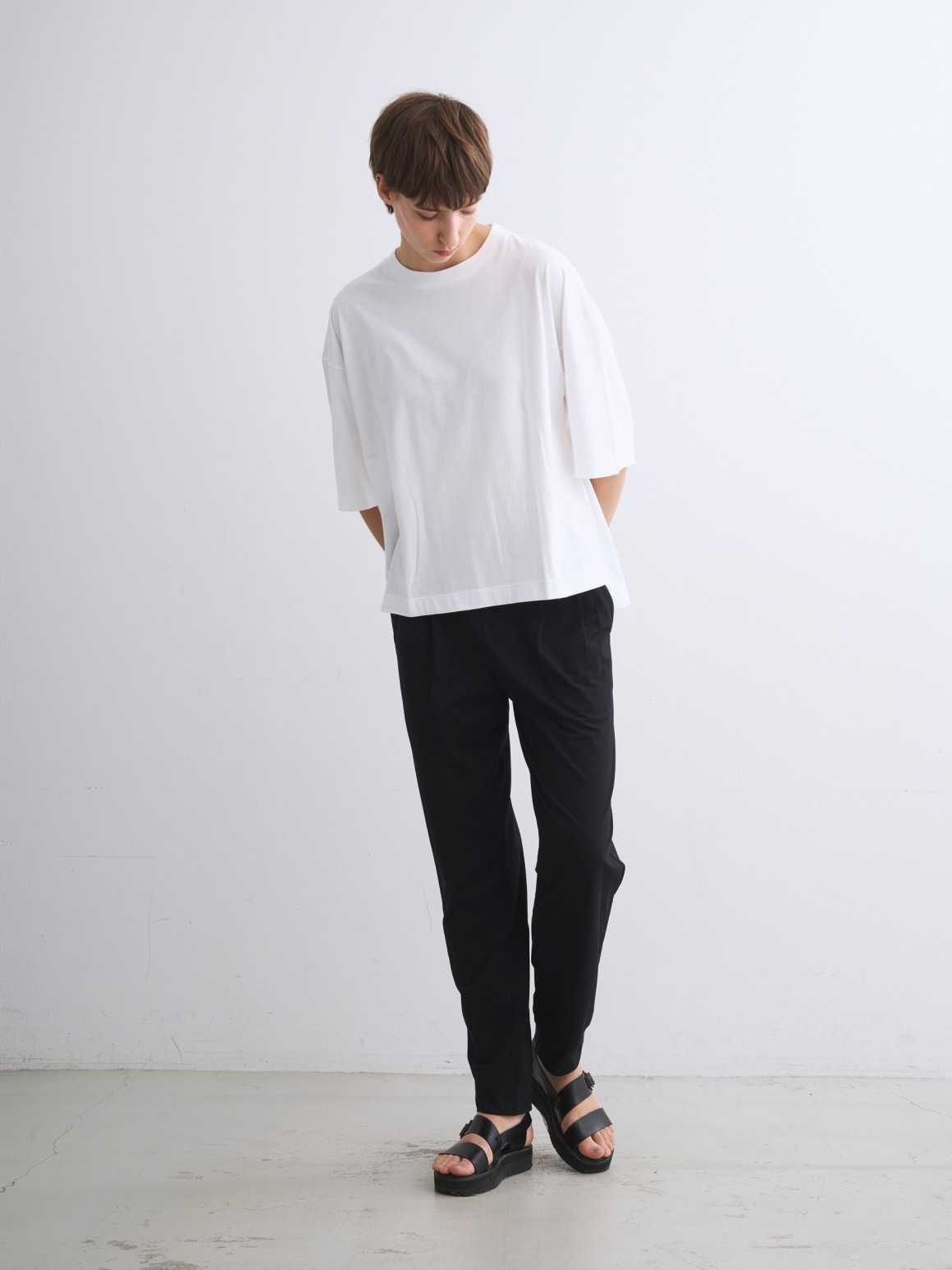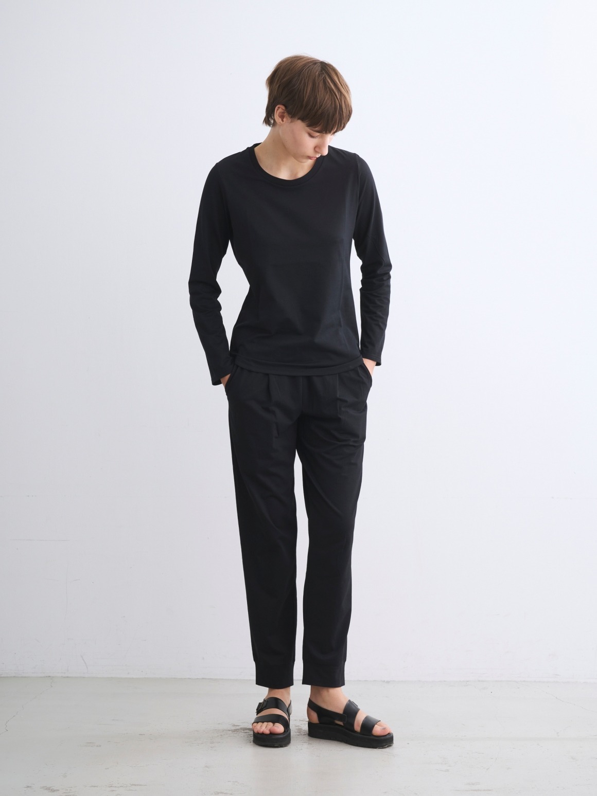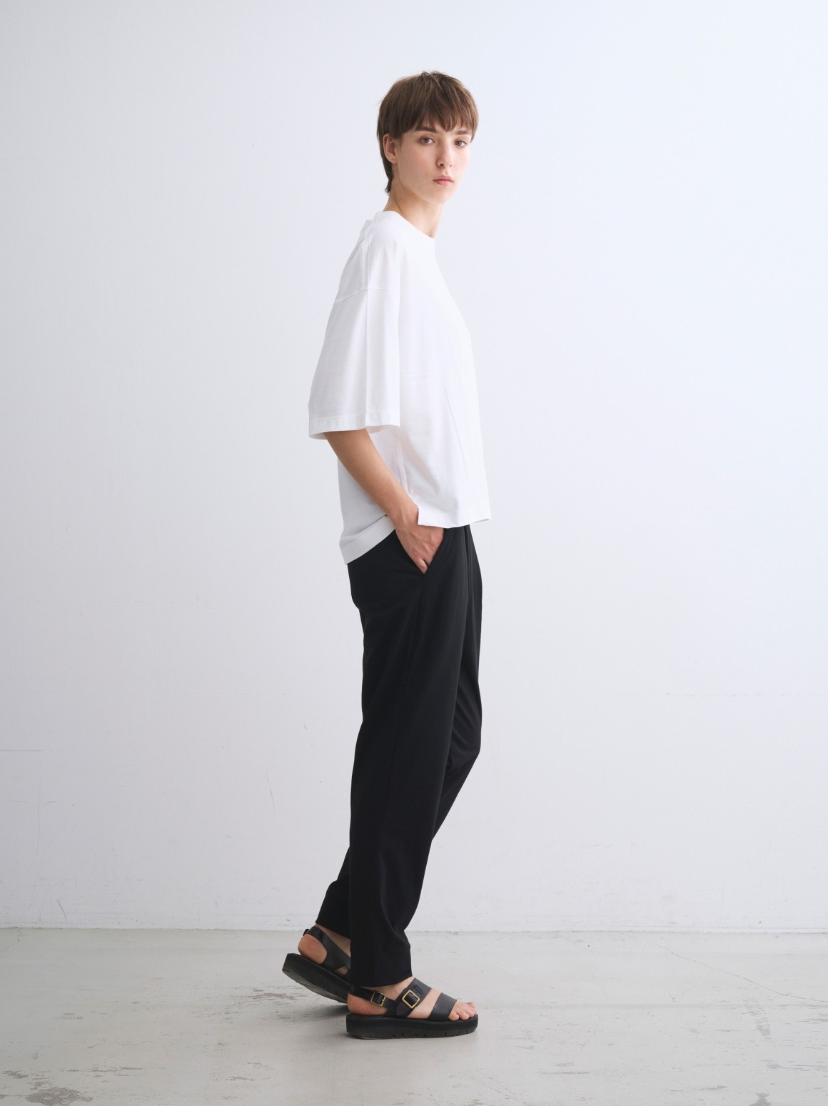 吸水性、速乾性に優れているのに加え、UVカットや赤外線反射で涼感をもたらす効果を備えています。パウダリーコットンの軽やかな着心地をパンツに落とし込み、全身で感じる特別な肌触りを叶えました。すっきりとしたシルエットでトップスを選ばないフィットです。