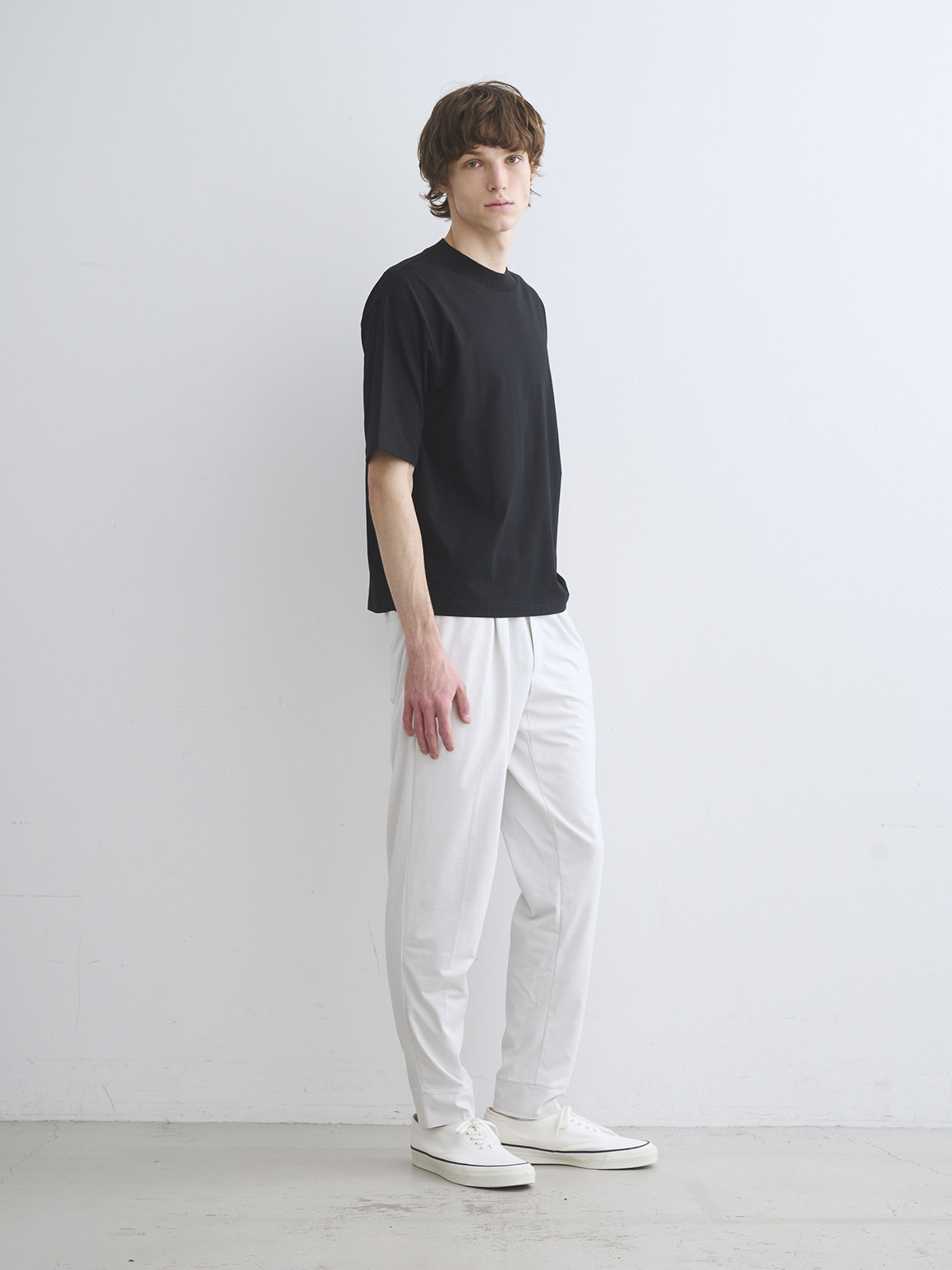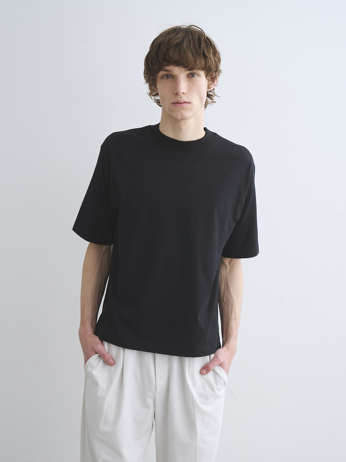 上質なスビン混をブレンドしたニットリブを、パウダリーコットン素材に組み合わせたスペシャルなTシャツ。ニットならではの柔らかさ、リラックスした風合いが特徴です。