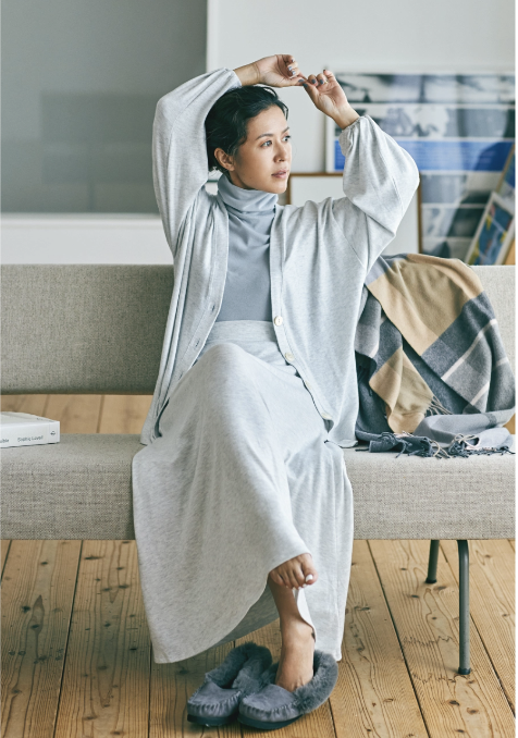 杢グレーのカーディガンとスカートのセットアップにミディアムグレーのカットソーター トルをインナーにチョイス。グレーのグラデーションが醸し出す洗練されたナチュラル感 がおうちでくつろぐ時に最適。リラクシングなだけじゃなくほんのりスポーティさも漂う 色だから、外出時はスニーカーやバックパックを合わせるとアスレジャーな雰囲気を楽し めそう。淡い色のインナーを合わせてもしっくり馴染んでくれるから、スタイリング全体 を柔らかく見せたいときにも重宝するはず。