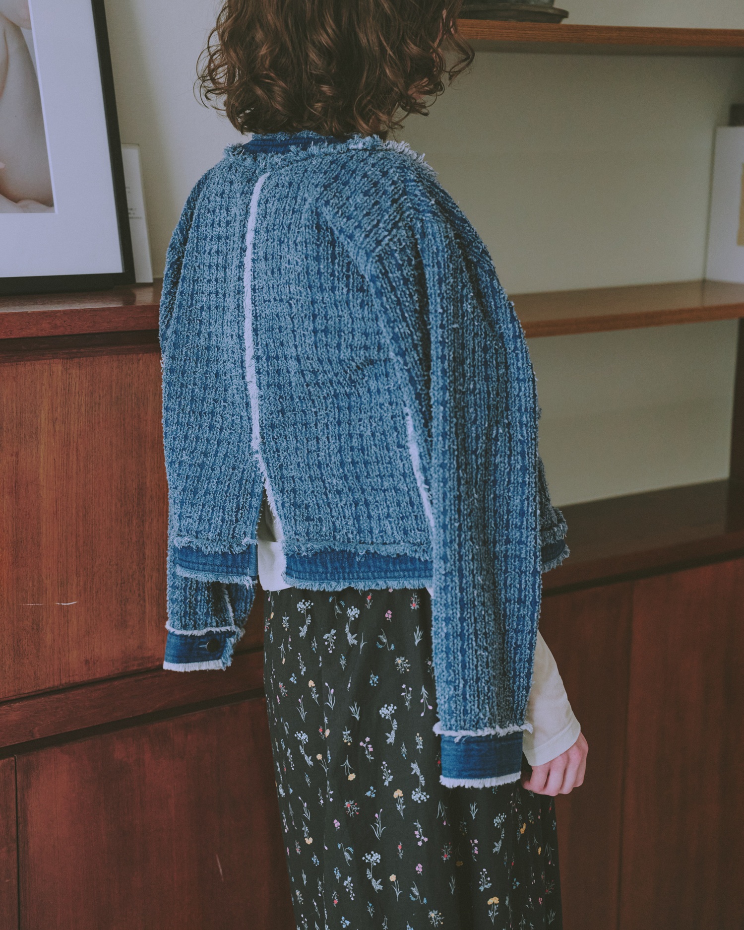 発売からすでに人気の「NEEDLE PUNCHED DENIM」。特殊な機械で針を差し、ループ状に繊維を掻き出していくという製法で作られたデニム生地です。ツイード調に落とし込んだデザインで、フェミニンにもカジュアルにもスタイリング可能。