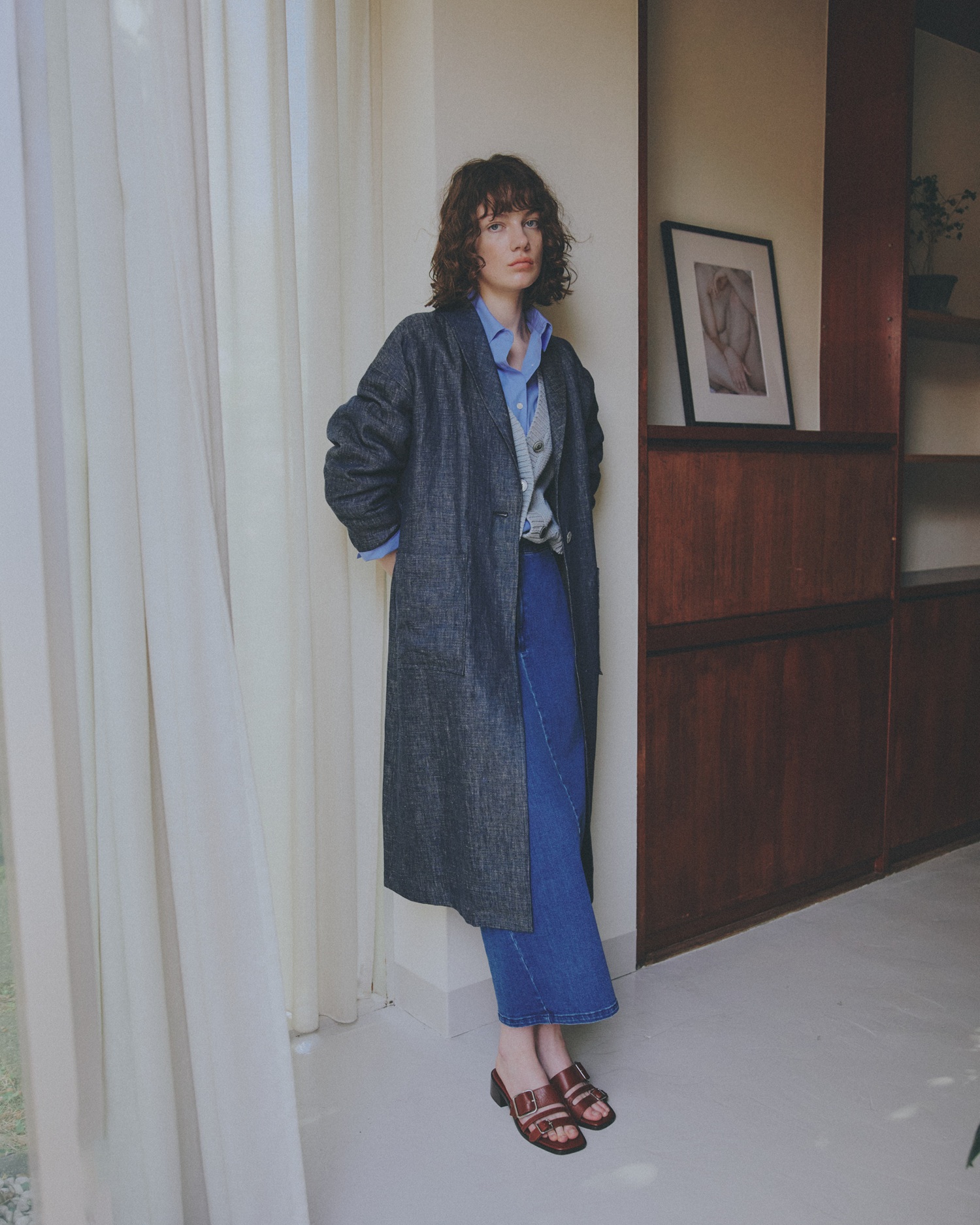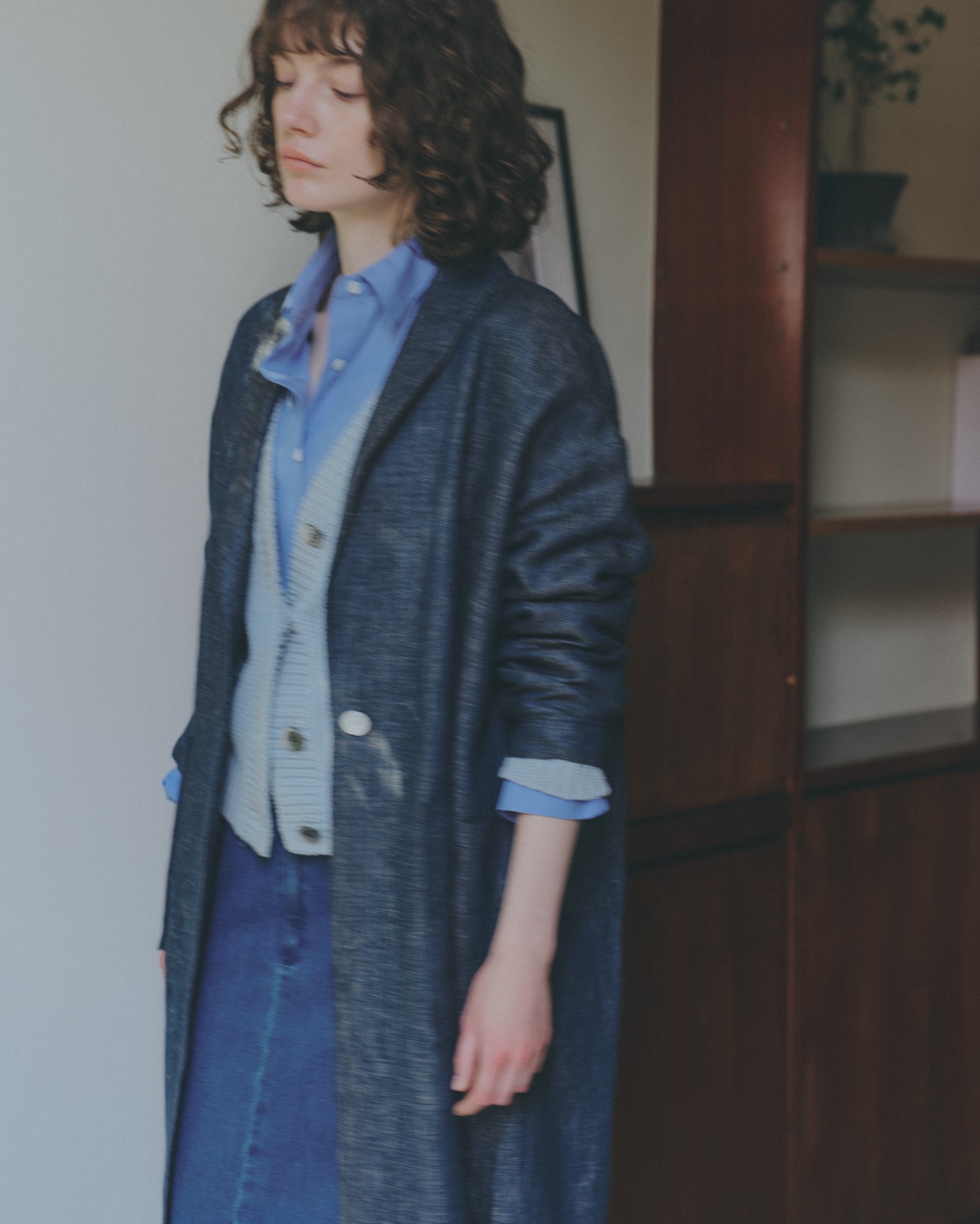 こちらも春の人気アイテム、「ROUGH LINEN DOCTOR COAT」からデニムライクな抜け感ネイビーが登場。まだ肌寒い季節には今季豊富なスプリングニットを重ね合わせて春らしいレイヤースタイルが完了。